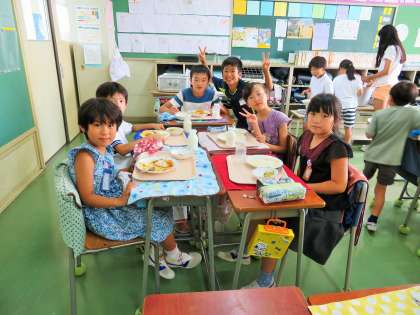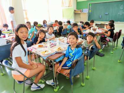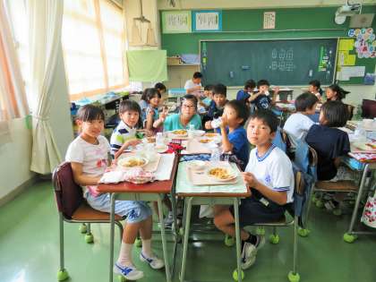 一つの班に1年生から6年生までが入った縦割りのグループで給食を食べます。和気あいあいと楽しそうに食べていました。