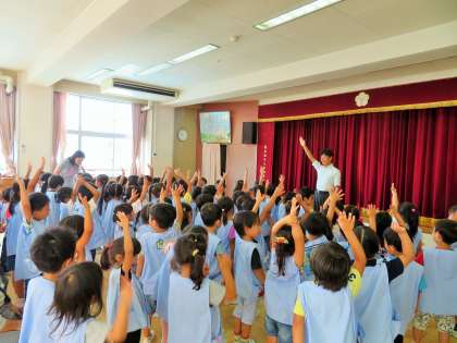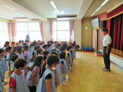 今日は砧幼稚園1学期終業式です。特に、年少さんにとっては初めての集団生活で不安も多かったと思います。一人一人に成長がみられ嬉しく思いました。