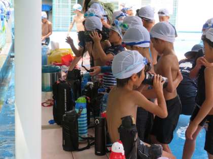 途中、水飲みタイムを取りながら指導を進めています。水筒持参にご協力いただきありがとうございます。ようやくプールに入れて、低学年の子ども達はとても楽しそうでした。