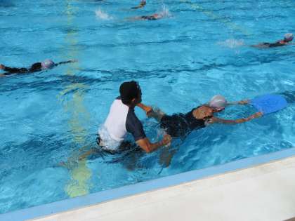 今日もたくさんの子ども達が水泳教室にやってきました。一般に高学年の子どもの参加は少ないと言われますが、今日は5,6年生合わせて、57名の参加がありました。高学年になると大の字浮きも美しく決まります。水慣れの後は、グループに分かれて練習しました。