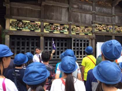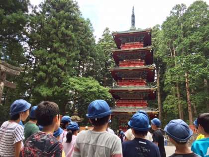 世界遺産の日光東照宮に到着しました。案内人の方が説明をしてくださり、子どもたちも真剣に聞いています。