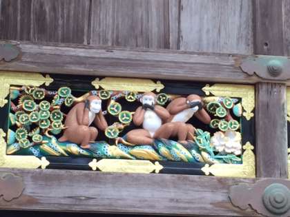 五重塔、そして修復を終えた「見ざる、言わざる、聞かざる」で有名な三猿の説明を聞きました。
