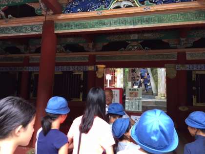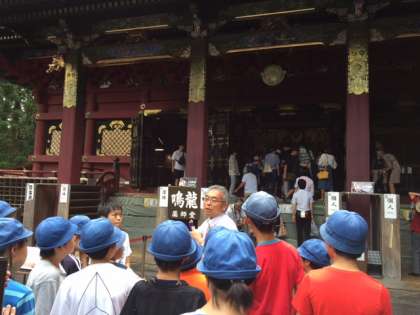眠り猫の説明、そして鳴龍を見学しました。龍のお顔の下で拍子木を打つと、音が共鳴して、いつまでも鈴のような音が響き渡っていました。