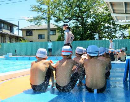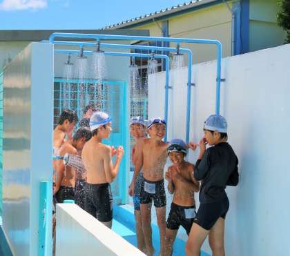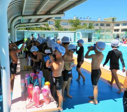 砧小学校では熱中症対策として、こまめな水分補給と休憩、プールサイドのミスト、冷たいシャワーで対応しています。