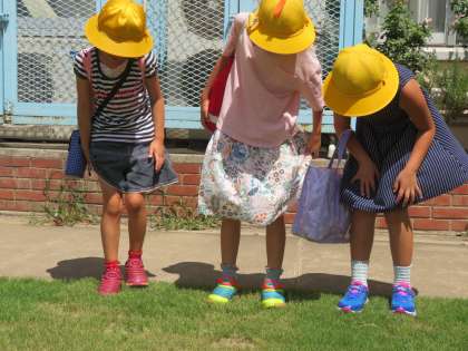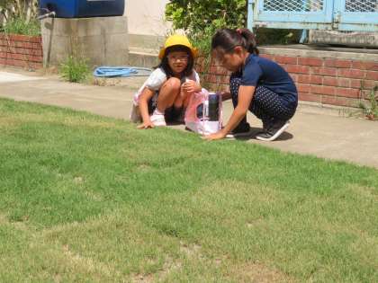 夏休み中に、校庭の一部に、芝生を植えていただいたところ、1か月たち、美しく生え揃いました。水泳に来た子ども達に「触ってごらん。」と促すと、「ふかふかだ。」「気持ちいい。」と、感想を述べていました。今はまだ養生期間ですが、9月になったら解禁です。芝の匂いを感じたり、寝転んで感触を楽しんだりと、芝生のある校庭を楽しんでほしいと思います。