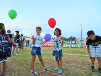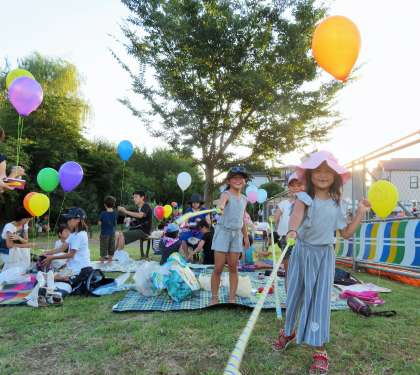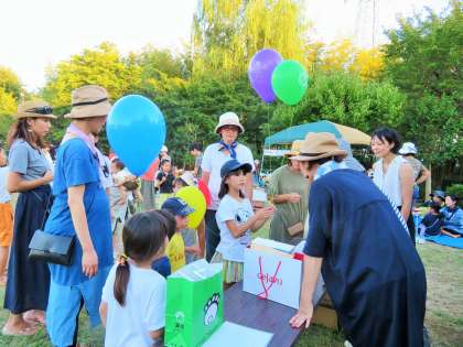 今日は猛暑の中、次大夫堀公園えのき広場で「夏休み締め括り子ども会」が開催です。喜多見上部自治会主催で、PTA校外委員会や児童館、プレイパークの皆さんなどの「遊びのコーナー」、自治会の皆様の「カレーライス」など、夏休みを締め括る楽しい催しがいっぱいでした。