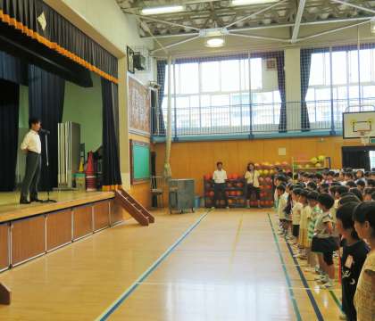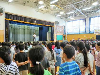 今日は2学期の始業式を体育館で行いました。体育館への入場から、子どもたちの表情は引き締まっていて、お喋りは一つもありません。ステージに上がると、たくましさを増した子どもたちが、一斉に私の方に注目をしました。この集中力、さすが砧小学校の子どもたちだなと嬉しくなりました。