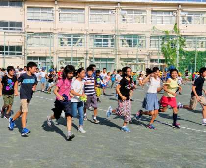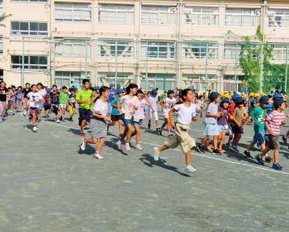 朝ランの音楽に合わせて、自分のペースでリズムよく走っている子、先生と一緒に走っている子、友達と競走をしながら走っている子など様々です。