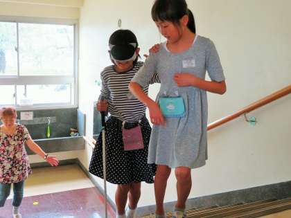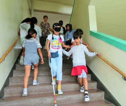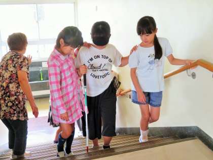 目の不自由な方々に不安がないように、周りの景色なども伝えながら歩けるようになると、きっと喜んでもらえると思います。子どもたちは、いつもの暮らしを振り返り、自分にできることがあるか考えました。