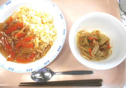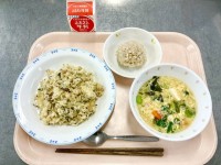 今日の給食は、<あんかけチャーハン>です。炊飯時にごま油を加えて炊いたご飯に、いり卵を混ぜます。そこに、給食室特製の野菜と鶏肉の入ったあんをかけて、いただきます。「今日の給食は、とてもおいしかったです。全部食べられました!」と低学年の子どもたちから嬉しい報告も受けました。子どもたちが、たくさんの食べものに出会い、味覚の幅を広げてくれたらよいなと思います。
