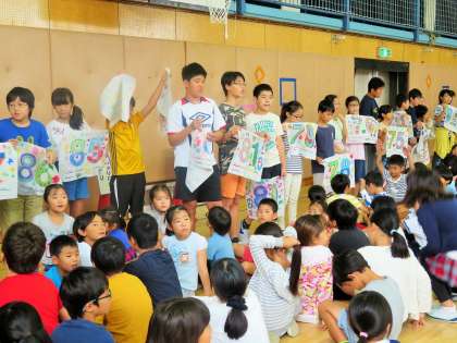 今朝の児童集会は集会委員会によるゲーム集会です。なかよし班ごとに集合をして、はじめの言葉、ルール説明がありました。