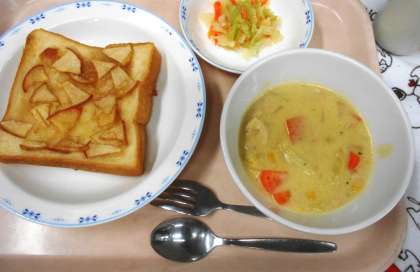 今日の給食の主食は、<アップルトースト>です。食パンにバターを塗り、スライスしたりんごと砂糖・シナモンをのせて、オーブンで焼きました。しゃきしゃきしたりんごの食感を楽しむことができる一品です。子どもたち、よく食べていました。秋はりんごがおいしい季節です。簡単にできますので、ぜひご家庭でもお試しください。