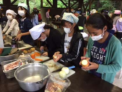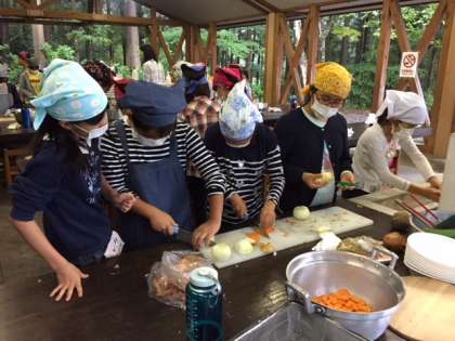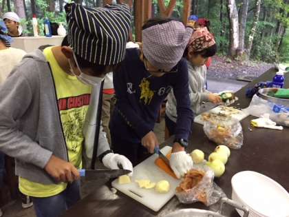 にんじん、たまねぎ、じゃがいもなどの野菜を切っています。
