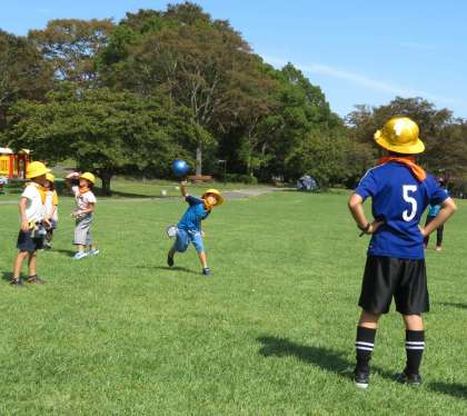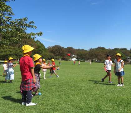 自由広場は、30,000平方メートルの草地の広場です。2年生が考えた遊びで、1年生を楽しませようと頑張っていました。