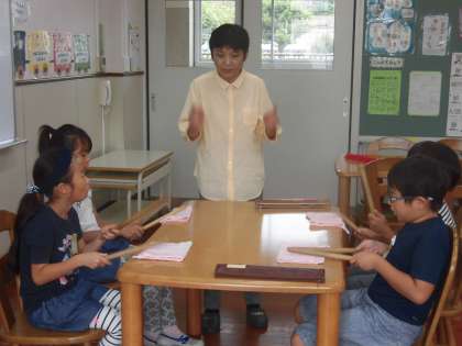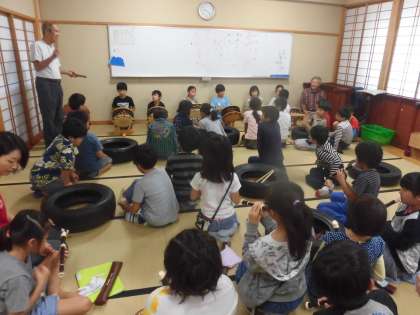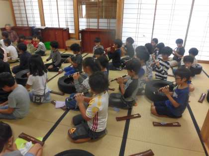 第3回目の練習は、はじめは、しめ太鼓と笛、大太鼓、鉦(かね)、拍子木、そして踊りと、チームごとに練習しました。