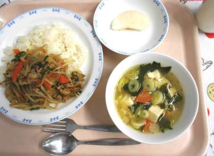 今日の給食は、ごはんと一緒にプルコギをいただく<プルコギ丼>です。プルコギは、韓国でよく食べられている肉と野菜のいためものです。プルは「火」、コギは「肉」という意味があります。