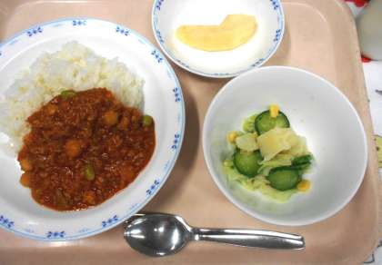 今日の給食は、<チリビーンズライス>です。今日は、ひよこ豆と枝豆を使いました。豆には、体を作るもとになるたんぱく質が豊富に含まれています。成長期の子どもたちには、特に食べてもらいたい食品です。デザートのりんごは、山形県産のもので、甘みと酸味がほどよく美味でした。