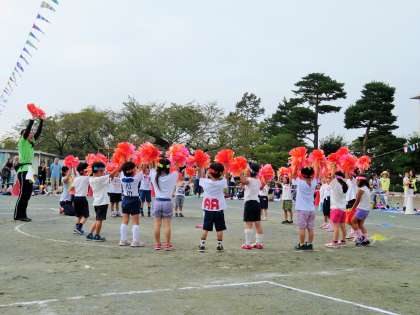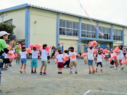写真は、年少「みんなで よーいどん!」、リズム「まいにち チャレンジャー」です。