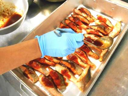 今日の主菜は、<魚のバーベキューソース焼き>です。今日は、トラフトサーモンをオーブンで焼き、上からケチャップやしょうゆ、オイスターソースなどをあわせた手作りのバーベキューソースをかけました。