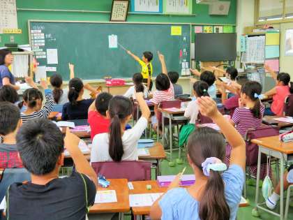 5・6年生は、英語のモジュールの授業です。英語に親しめるようにアニメーションを観たり、発音をしたりしながら取り組んでいます。