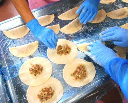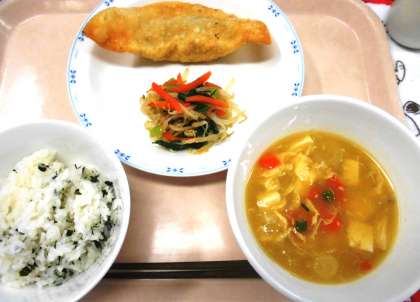 今日の主菜は、砧小の子どもたちに人気の<ジャンボぎょうざ>です。本校では、直径13cmと15cmのぎょうざの皮を使い、一つ一つ手で包んで作っています。