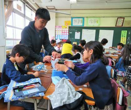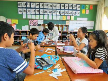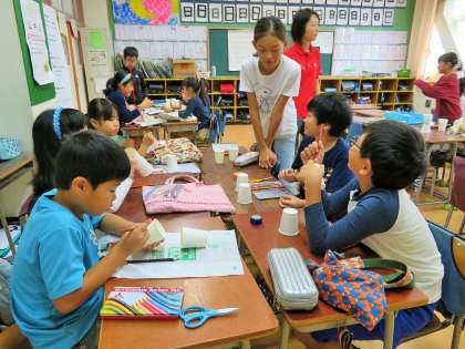 班ごとに作業開始です。リーダーはもちろん6年生です。遊ぶ道具を工夫して作っています。