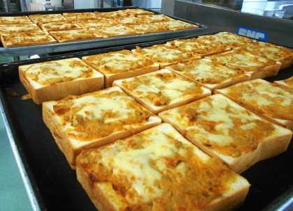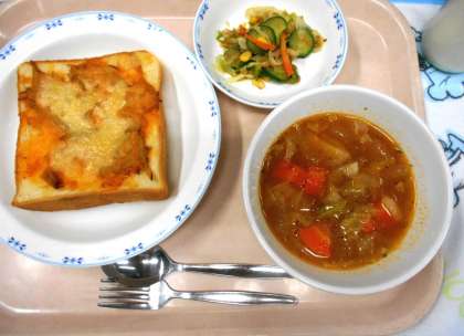 今日のトーストは、<ツナごぼうトースト>です。ツナと下ゆでしたごぼうをマヨネーズとケチャップで味をつけ、パンにのせ、上からチーズをかけて、オーブンで焼きました。ごぼうは野菜の中でも、特に食物せんいがたっぷりでおなかの調子をよくしてくれます。和食のイメージが強い食材ですが、洋風の味付けでもおいしくいただけます。