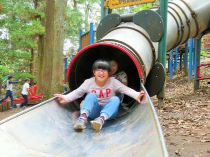 午後の部は、場所を移動して遊びました。人気のすべり台、ターザン、トランポリンの様子です。