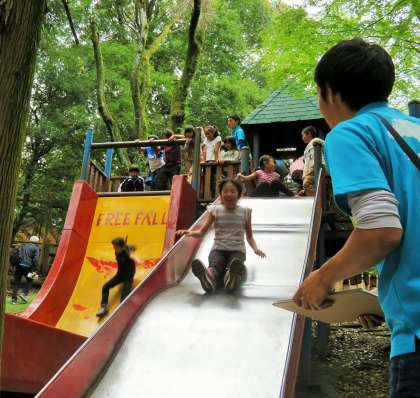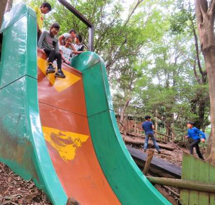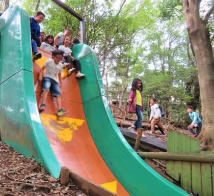 人気の遊戯施設「トムソーヤ 冒険の森」のすべり台です。直角のような急斜面に挑戦する子も・・・!