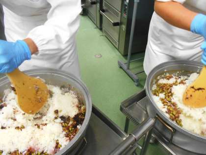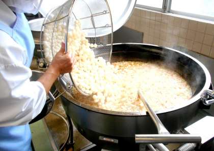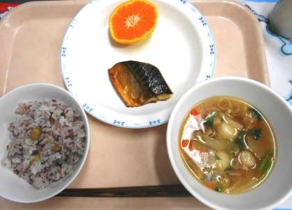 今日の給食は、<十三夜メニュー>です。十三夜とは、十五夜の後にめぐってくる日をさし、十五夜の次に月が美しく見える日と言われています。今年の十三夜は、10月21日(日曜日)です。きれいな月が見えるとよいですね。<お月見汁>には、白玉団子を加えました。だしの風味のわかるやさしい味の汁物に仕上がりました。