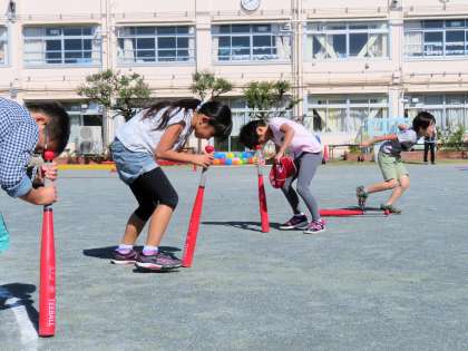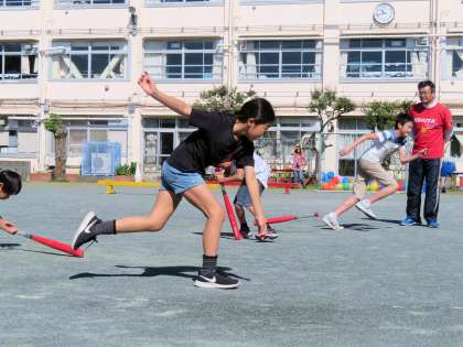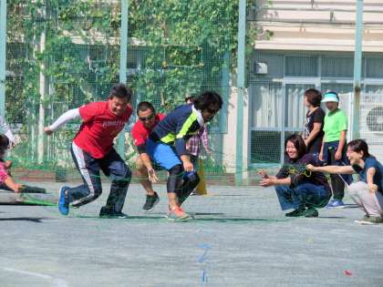 第5種目は、障害物競走です。5つの障害物がありますが、最後のぐるぐるバットは、予想以上に目が回ります。グループリーダーの「おやじ〜’s」の皆さんも本気です!