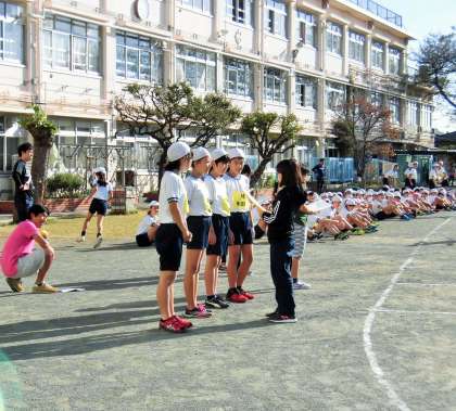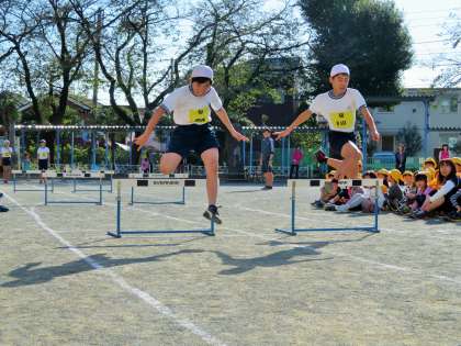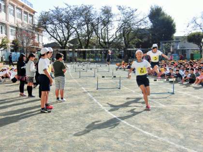 ハードル走の様子です。インタビューでは、種目の技能ポイントや意気込みを話してもらいました。