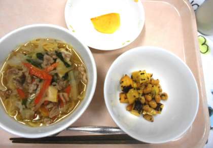 今日のデザートは、柿です。秋に旬をむかえる果物で、風邪の予防にもよいと言われています。子どもたちの中には、柿が苦手という子も多いようですが、栄養満点の旬の果物ですので、ぜひ食べてほしいと思います。