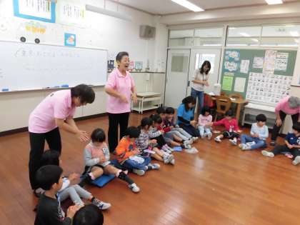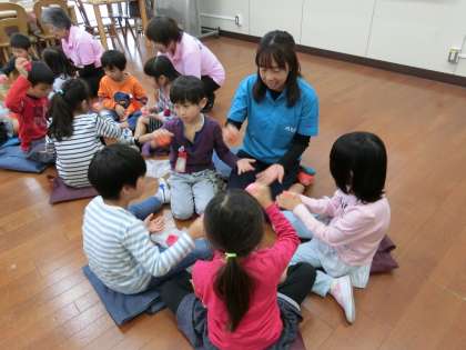 次は、歌に合わせて、タイミングよくお手玉を渡し合います。2人組、4人組とだんだん人数を増やしていきました。全員で輪になってできると壮観です。