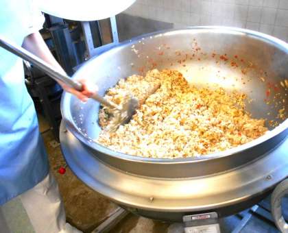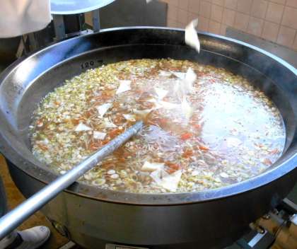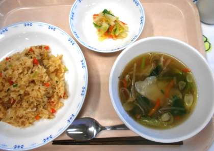今日の給食の<キムチチャーハン>は、リクエストで上位にあがる人気メニューです。キムチの辛さが食欲をそそります。本校では、辛さを3段階にわけて作っています。