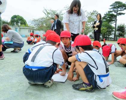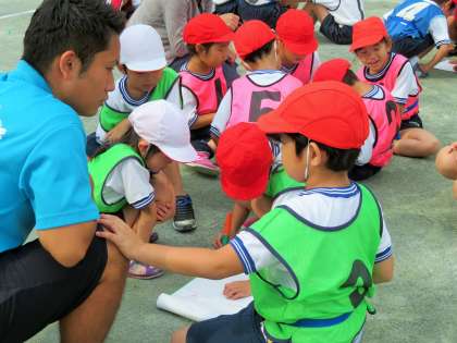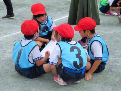 「チームタイム」でゲームの振り返りをしています。作戦はどうだったか、考えている姿があり嬉しく思いました。