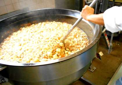 今日の主食は、<中華おこわ>です。給食では、もち米と米をあわせて使い、おこわを作ります。今日は干しえびや鶏肉、たけのこを使い、中華風の味付けです。どの学級も、比較的よく食べていました。