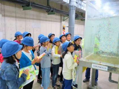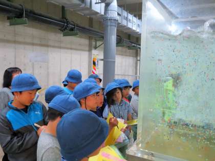 下水道管を通って水再生センターに流れ込んだ下水は、どのようにしてきれいになるのか、そのしくみを学習しました。