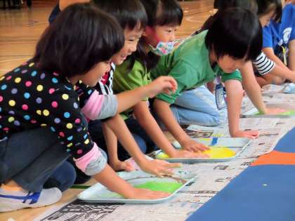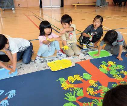 先生が用意したのは、10m程の模造紙に貼り付けた6本の木です。そこに、子どもたちは、手に絵の具を塗り、ぺたぺたと花を咲かせていきました。
