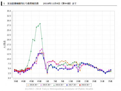 東京都の感染性胃腸炎流行状況です。赤色の■が今期の報告数です。http://idsc.tokyo-eiken.go.jp/diseases/gastro/gastro/