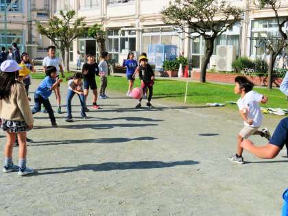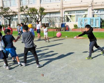「ドッジボール」をして遊んでいます。今日も高学年の子どもたちは、下から投げたり、緩いボールで手加減をしながら投げたりしている姿が多くみられました。