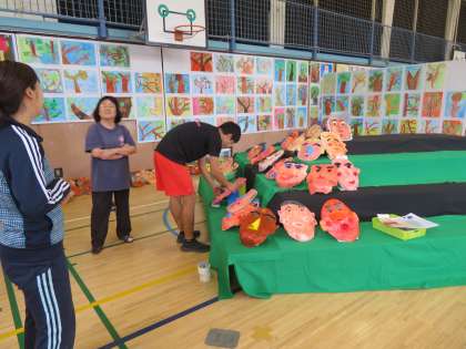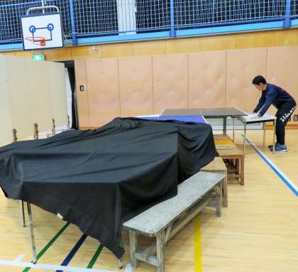 連日遅くまで、体育館で準備作業をしている先生が大勢います。外は真っ暗、お腹がすいても、展覧会の準備をしています。