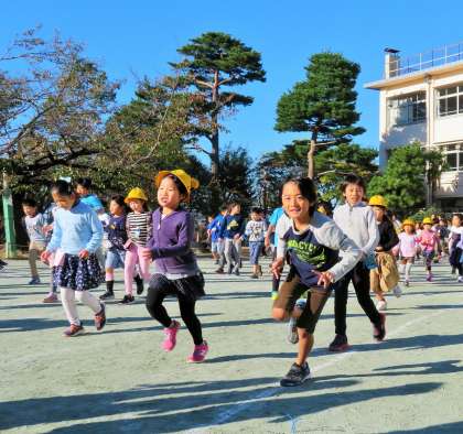 軽快な音楽が流れると、それに合わせてリズムよく走っています。朝遊び・朝ランニングで脳を活性化し、授業での集中力もアップさせていきます。