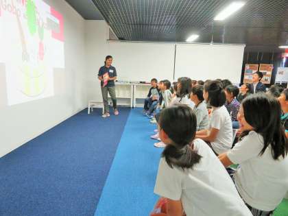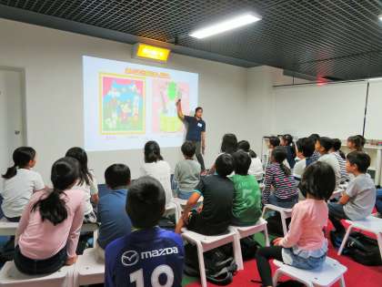 「読み聞かせ」のコーナーでは、DVDの映像を使いながら、外国人の先生が質問したり、絵本の表現を一緒に発音したりしました。
