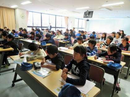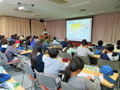 日野自動車羽村工場に到着しました。敷地がとても広く、東京ドーム16個分の大きさをもつ工場です。担当の方から事前の説明を受け、最先端の自動車を組み立てている製造技術や製造プロセス、検査の映像を見せていただきました。子どもたちは、熱心にメモをはしらせていました。