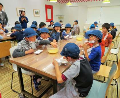キュウリに、手作りのマヨネーズをつけて食べました。おいしさの秘密、ものづくりへの想いと工夫などを学びました。