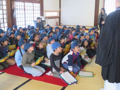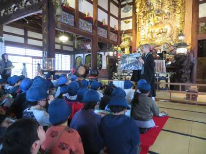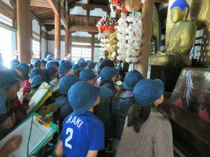 九品仏に古くから伝わる伝統行事の「おめんかぶり」の話などを、お寺のお坊様に伺いました。普段は入ることのできない所まで入れていただき、興味深いお話を、メモをとりながら真剣に聞くことができました。