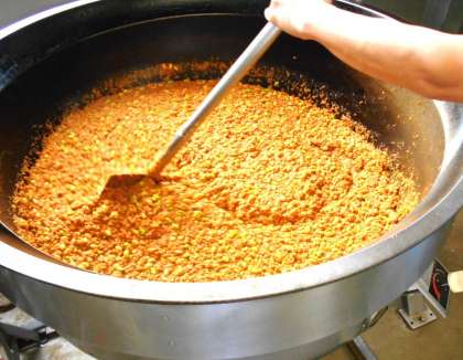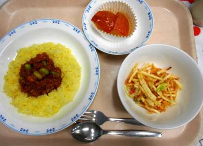 <お話給食>第1日目の今日のお話は、「うちにかえったガラゴ」です。このお話に登場するをドライカレーと焼きりんごを砧小風にアレンジして作りました。
