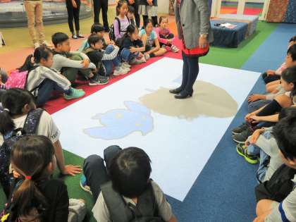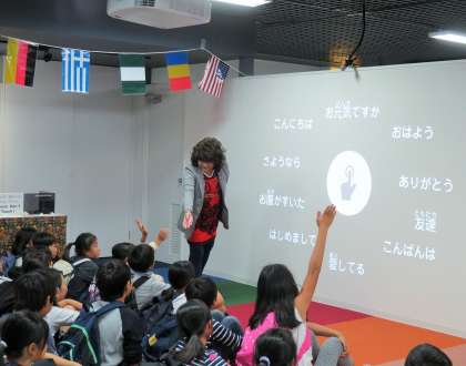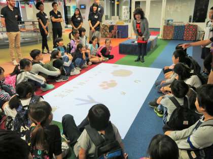 「エントランス」は、日本語であいさつをすると、その言葉に反応して、いろいろな国の言葉が出てきたり、床に映った動物の足跡を踏むと、その動物の姿や英語での呼び方がわかったりします。