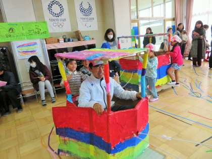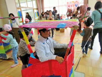 砧幼稚園「どきどきわくわく きぬたどうぶつえん」の様子です。多摩動物公園遠足の後、遠足を振り返りながら、「モノレール」「トナカイのわなげ」「ゾウのすべりだい」「テナガザルのジェットコースター」「オラウータンのえさやり」「ユキヒョウのまとあて」など、6つのアトラクションを作りました。